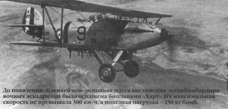 Регистрационный номер: K2119 До появления "Бленхеймов" основная масса английских легкобомбардировочных эскадрилий была оснащена бипланами "Харт". Их максимальная скорость не превышала 300 км/ч, а полезная нагрузка - 250 кг бомб.