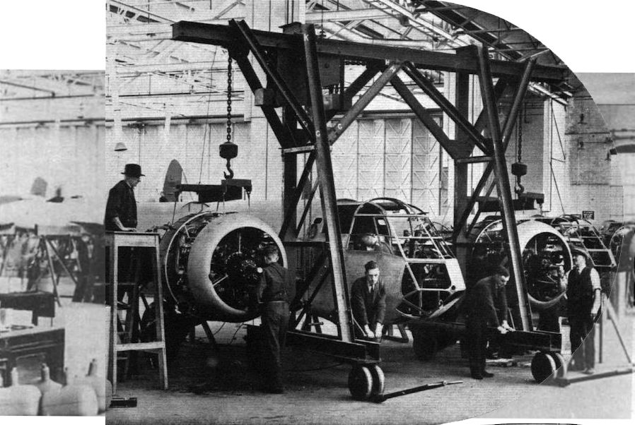 The Blenheim is powered by two "Bristol" Mercury engines which are fitted to the air-frame prior to its removal from the jig by a special transportable crane. It is then ready for the attachment of the wings and tail unit.Самолёты на фотографии: Bristol Blenheim - Великобритания - 1936