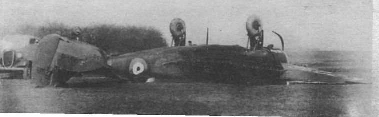 Уже через несколько дней после начала немецкого вторжения союзные авиабазы погрузились в пучину неразберихи. На снимке виден потерявший управление французский "Потез-25", "въехавший" на пробеге в "Бленхейм" 53-й эскадрильи. Франция, май 1940 г.