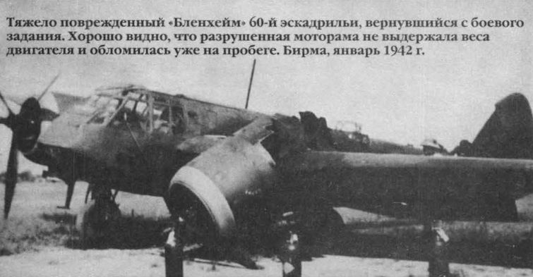 Тяжело поврежденный "Бленхейм" 60-й эскадрильи, вернувшийся с боевого задания. Хорошо видно, что разрушенная моторама не выдержала веса двигателя и обломилась уже на пробеге. Бирма, январь 1942 г.
