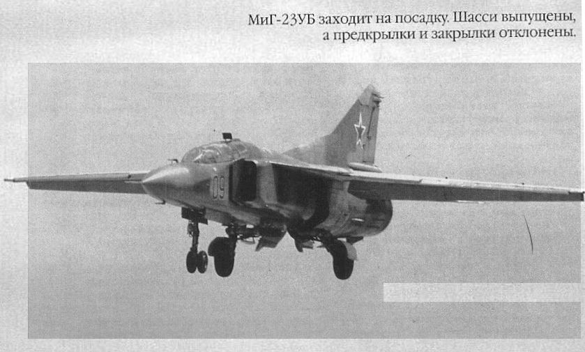 МиГ-23УБ заходит на посадку. Шасси выпущены, а предкрылки и закрылки отклонены.