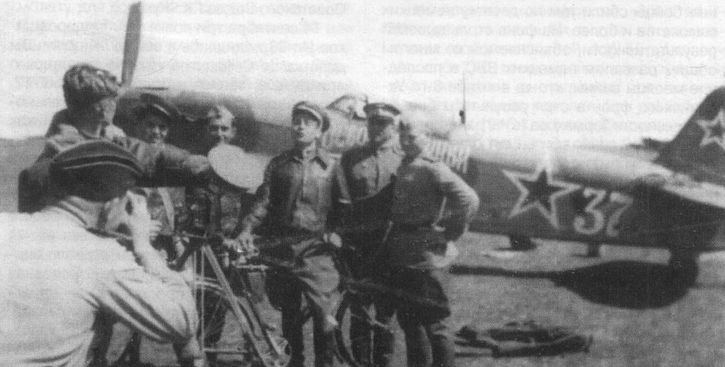 Як-9 Дмитрия Тормахова (сам он второй слева) на югославском аэродроме Бачка Брестовац, весна 1945 г.