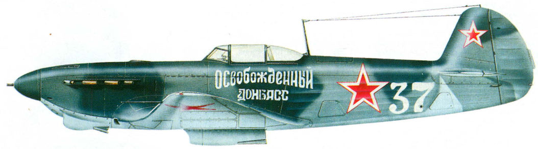 Окраска: на верхних плоскостях сочетание пятен темно-серого и серо-голубого цвета, снизу - светло-голубой. Надпись «Освобожденный Донбасс» белого цвета, выполнена на заводе. Бортовой номер - белый.Самолёты на фотографии: Яковлев Як-9Т / Як-9М - Россия - 1942