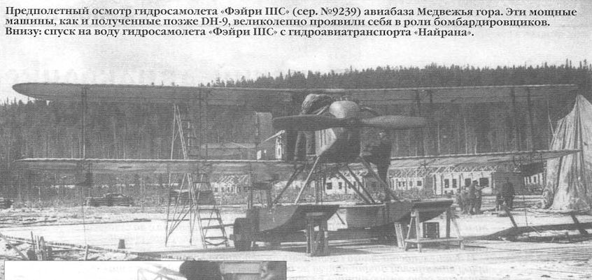 Регистрационный номер: N9239 Предполетный осмотр гидросамолета «Фэйри IIIC» (сер. №9239) авиабаза Медвежья гора. Эти мощные машины, как и полученные позже DH-9, великолепно проявили себя в роли бомбардировщиков.