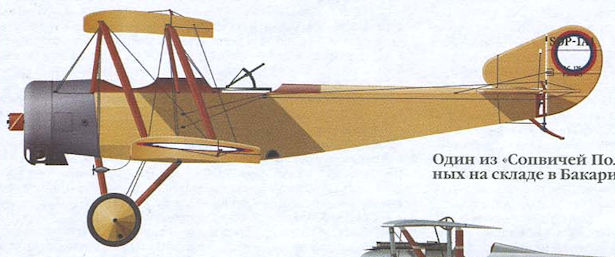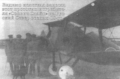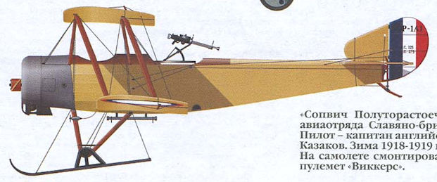 «Сопвич Полуторастоечный» из состава 1-го авиаотряда Славяно-британского авиакорпуса. Пилот - капитан английской службы Александр Казаков. Зима 1918-1919 гг. На самолете смонтированы бомбодержатели и пулемет «Виккерс».