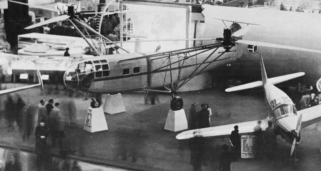 Регистрационный номер: F-AJOQ, F-BBBO, F-BBKC, F-WBBZ In the centre of this view, the Breguet G11E helicopter had two contra-rotating three-blade rotors and a tailplane mounted atop a single tall fin. It had a long fuselage with streamlined nose and a fixed spatted undercarriage. Its 240 hp 9-cyl Potez 9E radial engine was not yet fitted and during the Show the rotors were turned over slowly by a 4 hp electric motor. Breguet's helicopter experience went back to 1907 when the Breguet-Richet helicopter became the first to lift itself off the ground, although it was not able to fly forward under control. Three prototypes of the G11E were built but it did not go into production. One of them, F-WFKC is preserved in the Musee de l'Air.
