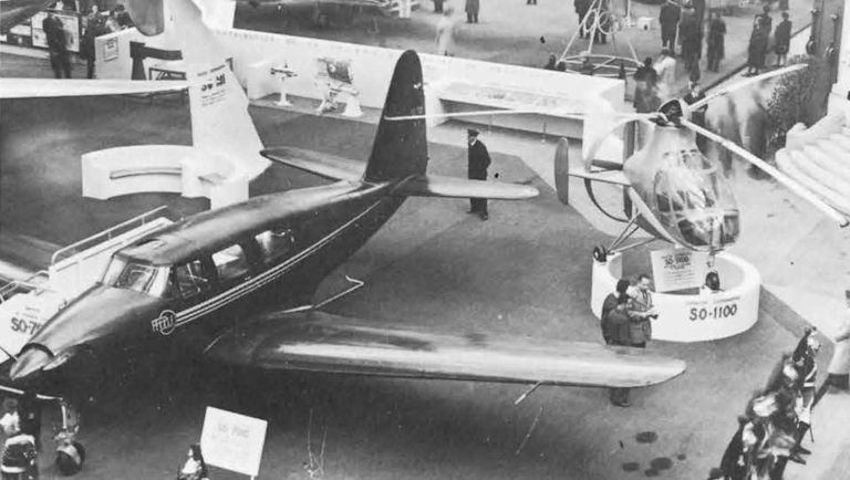 On the right is the SO.1100 Ariel which was basically a helicopter with a pusher propeller added. It was a compact egg with a bright orange paint scheme. The three jet-tipped rotor blades were driven by a Turbomeca compressor powered by its 170 hp 7-cyl Mathis G7R radial engine. This also supplied shaft drive for a wooden 3-blade fixed pitch pusher propeller inside an annular ring, replaced by an orthodox tail boom on the SO.1110 and SO.1120.Самолёты на фотографии: Sud-Ouest SO.1100 Ariel - Франция - 1947Sud-Ouest SO.7010 Pegase - Франция - 1948