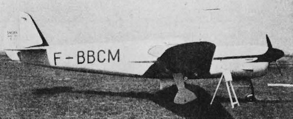 Top right and inset is the SE.2100 "tailless" monoplane prototype, a very neat side-by-side cabin 2-seater with a fixed tricycle undercarriage. The 140 hp Renault 4Pei 4-cyl inverted in-line engine was mounted as a direct drive pusher with a 2-blade Legere propeller. Some problems were experienced with the engine cooling air supply from the underside intake. The wing had endplate fins and rudders, 30° sweep, and plain flaps occupied the trailing edge space inboard of the ailerons. It was built for aerodynamic research but afterwards it was proposed to develop it for private owner use. However, it seems this came to nothing, perhaps because the limited cabin space which, while suitable for experimental use, might have been considered cramped for travel and leisure. The SE.2100 was shown unregistered.