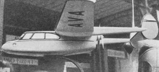 A model was displayed of the Czech Avia 38A, a light alloy stressed-skin twin-boom 5-seat cabin monoplane with two 160 hp Walter Minor 6-III engines geared to drive contra-rotating pusher propellers. It was said to have had a retractable tricycle undercarriage, but nothing more was heard of it.