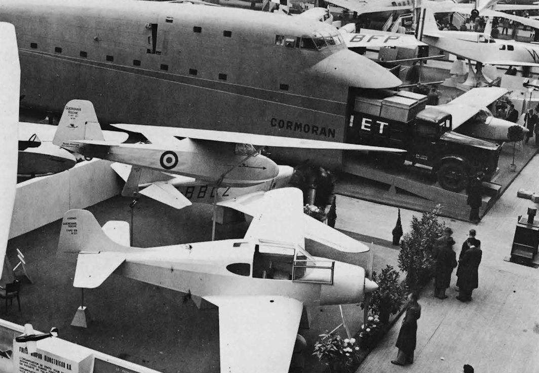 Overhead in the centre is the prototype Guerchais-Roche T107E single seat training glider and below it is F-BBCZ, the prototype T35 two-seater with 140 hp Renault 4Pei from which the T39 was developed.Самолёты на фотографии: Guerchais-Roche T.107 - Франция - 1945Guerchais-Roche T.35 / T.39 - Франция - 1944SNCAC NC.211 Cormoran - Франция - 1948SNCAC NC.840 Chardoneret - Франция - 1947