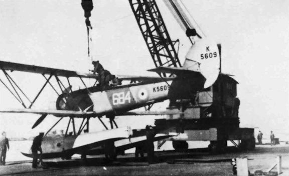 Регистрационный номер: K5609 K5609 of No. 821 Squadron is hoisted on to Gun Quay, Gibraltar, 1936.