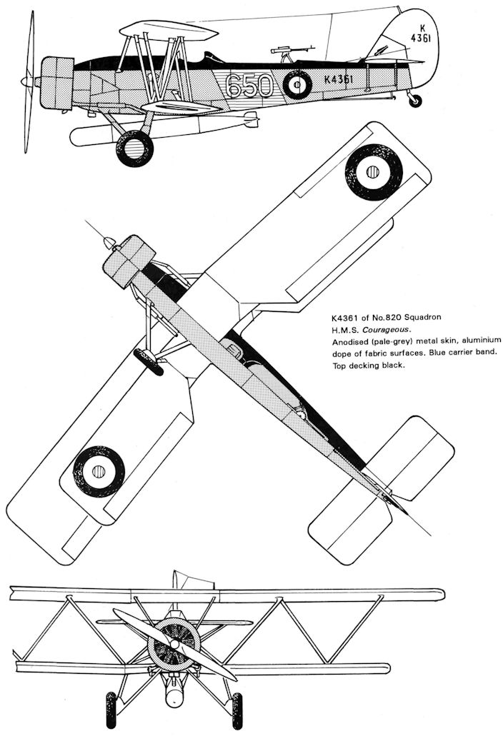 K4361 of No.820 Squadron, H.M.S. Courageous. Anodised (pale-grey) metal skin, aluminium dope of fabric surfaces. Blue carrier band. Top decking black.