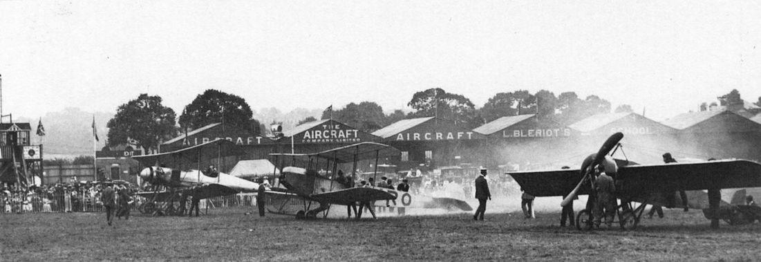 A typical scene at Hendon Aerodrome before World War One, with a Breguet biplane, Avro 500 and Morane monoplane preparing for take-off.
