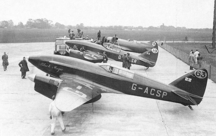 Entrants in the October 1934 MacRobertson England-Australia Race at RAF Mildenhall on the eve of the start of the race. Nearest the camera is the Mollisons' D.H. Comet G-ACSP Black Magic; next is the green Comet G-ACSR of Waller and Cathcart-Jones, with Granville R-6H NR14307 in the background. The preparations for the race, and its progress, were reported in detail in The Aeroplane.Самолёты на фотографии: De Havilland Comet / D.H.88 - Великобритания - 1934Gee Bee QED - США - 1934