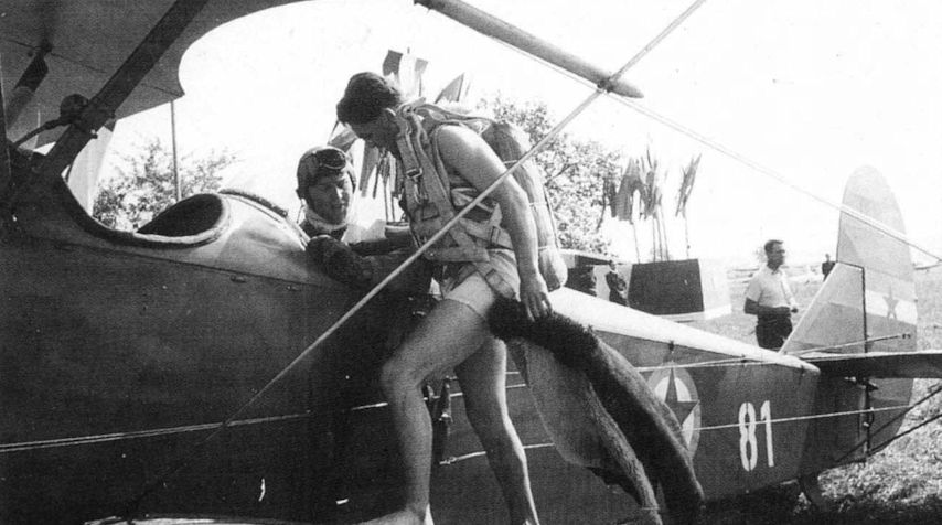 The author and Chuck Thompson discuss the run-in for the water-jump in the first World Parachuting Championships at Lake Bled in August 1951. The Yugoslav Aero Club provided a Polikarpov Po-2 for the event, affording Fricker a rare opportunity to experience the aviation scene behind the Iron Curtain. Chuck unfortunately released his harness too soon on the way down. He went into the lake like a bomb, from about 60ft, but luckily survived with nothing worse than a couple of black eyes.