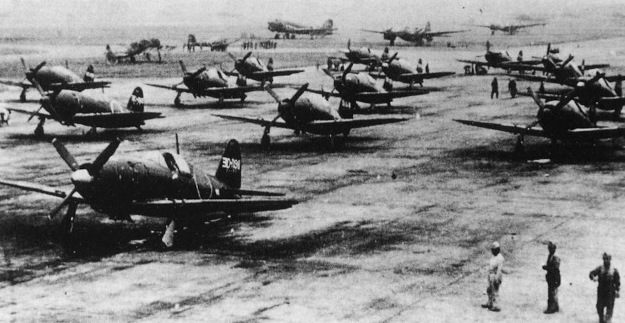 A crowded flight line at Atsugi, home of the 302nd Kokutai. Plainly visible in this view are a number of Mitsubishi J2M Raidens, probably the finest interceptor produced by Japan. Note that the tail code on these fighters is a reverse E and a normal D-; this was the commonest code for the 302nd, although occasionally it used 02- instead. The Raiden in the foreground appears to have a number of victory markings directly under the code.