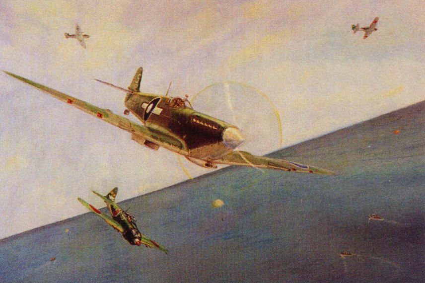 This painting by Rod Kirkby depicts Gerry Murphy in his 887 Sqn Seafire II, having just downed a Zero of the 302nd Kokutai.
