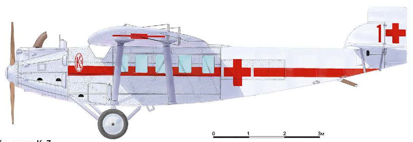 Санитарно-медицинский самолет К-3. Являлся первым советским самолетом подобного класса. Отличительными особенностями являлись повышенная комфортабельность салона, а также специализированная дверь для погрузки пациентов на носилках