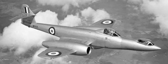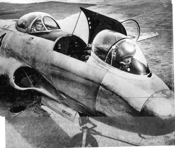 Регистрационный номер: WK935 [4] Снимок в полете экспериментального самолета Gloster «Meteor» F8 WK935 с дополнительным 796-литровым топливным баком и двумя пилотами в своих кабинах. Этим самолетом никогда не управляли в одиночку из передней кабины, так как запуск двигателей и контроль за расходом топлива был возложен на пилота во второй кабине