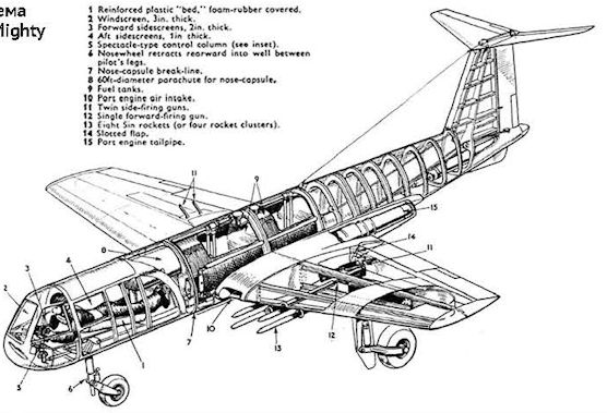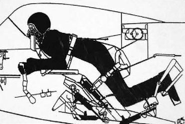 Регистрационный номер: WK935 [4] На самом деле пилот в передней кабине самолета Gloster «Meteor» F8 WK935 не лежал полностью горизонтально, его кушетка имела наклон примерно на 30° от горизонта от груди к коленям с небольшим уклоном в бедрах. От коленей кушетка снова отклонялась вверх, чтобы задействовать две педали управления рулем направления. Четыре винтовых домкрата с электрическим приводом позволяли регулировать положение уровня глаз, длину до бедер и досягаемость до педалей руля направления
