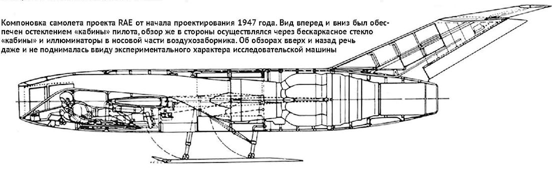 Компоновка самолета проекта RAE от начала проектирования 1947 года. Вид вперед и вниз был обеспечен остеклением «кабины» пилота, обзор же в стороны осуществлялся через бескаркасное стекло «кабины» и иллюминаторы в носовой части воздухозаборника. Об обзорах вверх и назад речь даже и не поднималась ввиду экспериментального характера исследовательской машины
