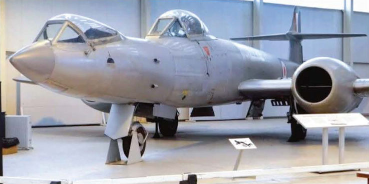 Регистрационный номер: WK935 [4] Самый длинный построенный «Метеор» (длина 15.98 м) - экспериментальный самолет Gloster «Meteor» F8 WK935 в Ангаре исследований и разработок косфордского музея Королевских ВВС. За носовым обтекателем расположен нижний иллюминатор, который давал пилоту в первой кабине возможность наблюдать землю во время посадки
