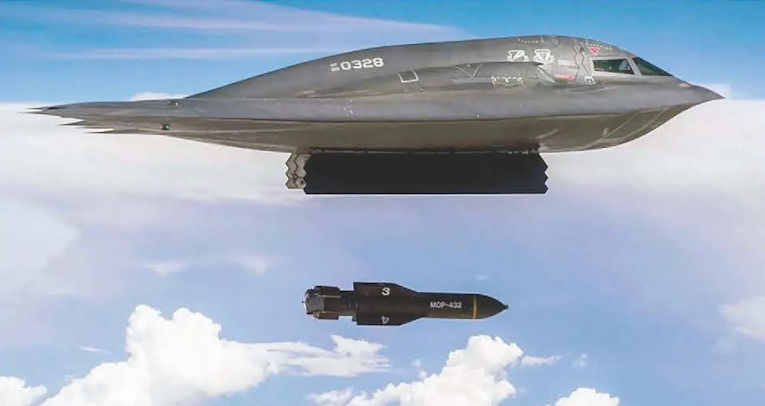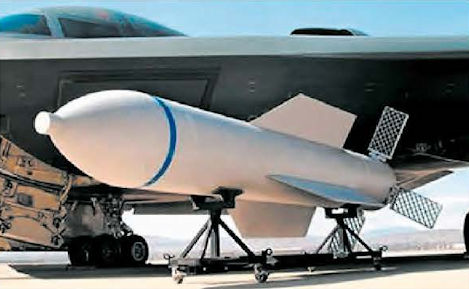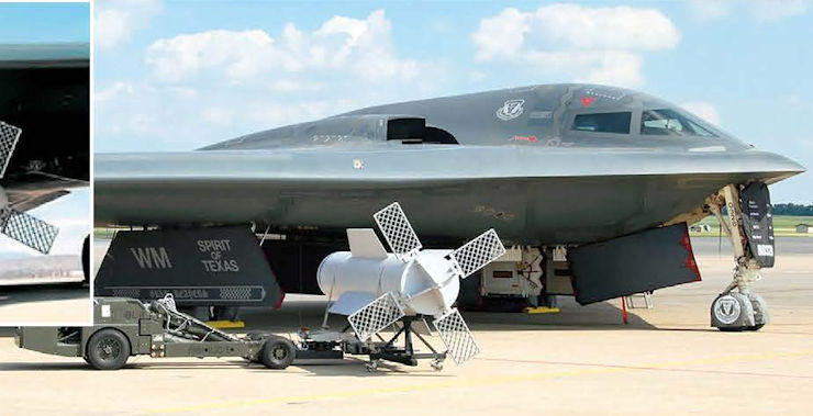 Макет бомбы GBU-57 MOP перед бомбардировщиком B-2A. Решетчатые стабилизаторы-рули раскрыты.