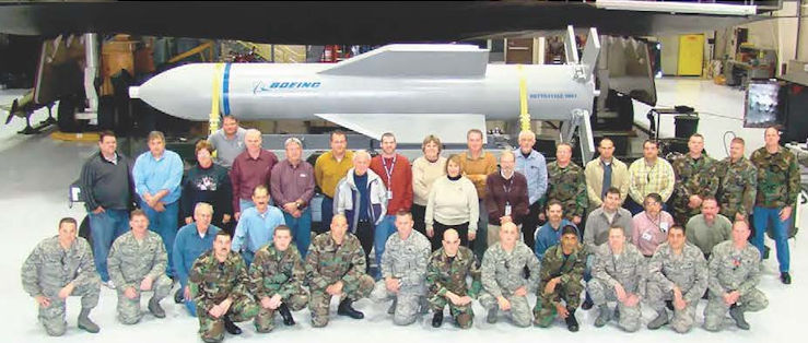 Военнослужащие и подрядчики ВВС США позируют перед макетом бомбы GBU-57 MOP. Чёрный потолок на заднем плане - это учебный стенд для обучения оружейников в подвеске боеприпасов в самолёт B-2A. Данный стенд представляет собой нижнюю поверхность бомбардировщика с бомбовыми отсеками, люками и прочим оборудованием. В левой части снимка виден макет атомной бомбы B-61. Авиабаза Уайтмен, шт. Миссури, 2007 г.