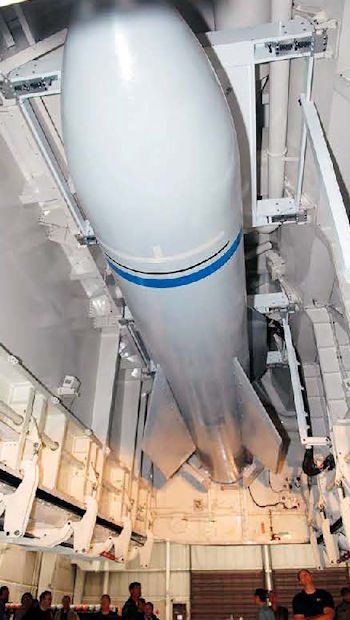Макет бомбы GBU-57 MOP с другого ракурса. Слева видна штатная загрузочная машина, с помощью которой боеприпасы загружают в бомбардировщик
