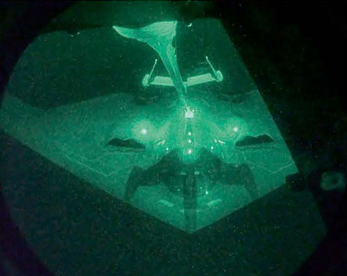 Дозаправка в воздухе, особенно ночью, - очень непростое дело. Экипаж B-2A ищет самолёт-заправщик с помощью бортового локатора AN /APQ-181 и с помощью инфракрасной станции. На близком расстоянии ориентируются на аэронавигационные огни (БАНО) танкера. Экипаж заправщика, в сою очередь, ориентируется на БАНО бомбардировщика