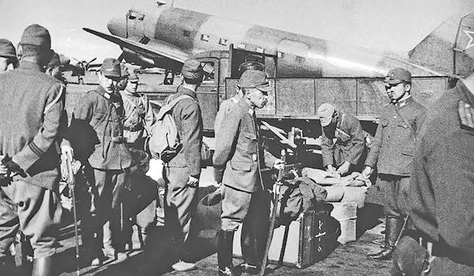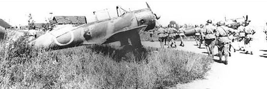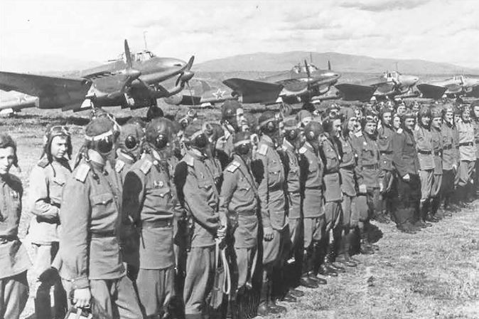 Захват японского аэродрома советскими десантниками. На переднем плане стоит один из наиболее распространенных самолетов Квантунской армии - Тачикава Ки-55 (самолет повышенной подготовки «Тип 99»), созданный на базе самолета непосредственной поддержки войск Ки-36. Справа виден Мицубиси Ки-51 (штурмовик армейский «Тип 99»)