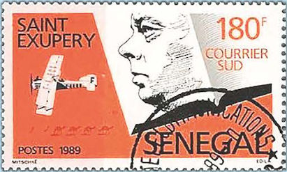 Сенегальская почтовая марка с изображением Антуана де Сент-Экзюпери, работавшего пилотом в авиакомпании «Латекоер», и силуэтом самолета Бреге XIV над песками Северной Африки