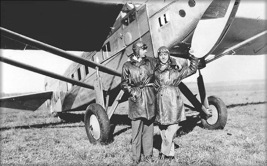 Антуан де Сент-Экзюпери в кабине самолета Кодрон C.635 в период подготовки к неудачному трансамериканскому перелёту 1938 года. За ним сидит его механик Андре Прево, погибший в ходе того перелёта