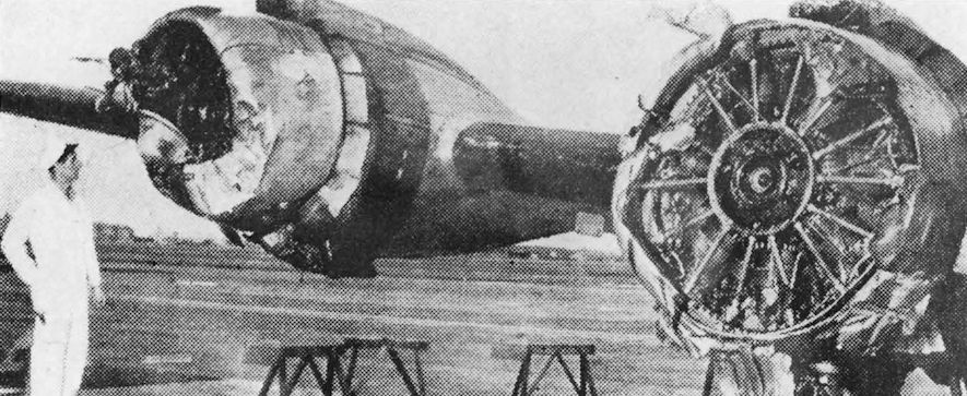 The C-54 which landed safely after hitting a hill top between Los Angeles and Burbank on 3.12.47 may be identified below. This photo, via John Wegg, shows the damage to the starboard engines and missing propellers.