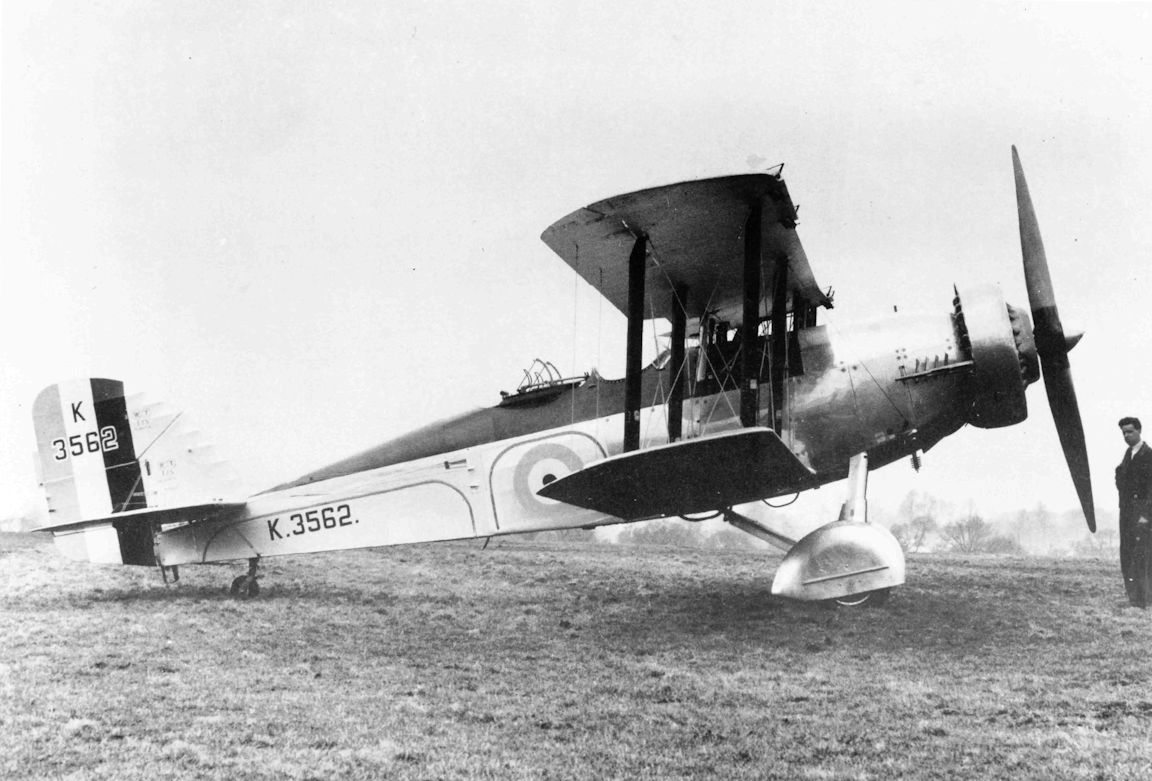 Регистрационный номер: K3562 [3] The first production Wallace I K3562. Note the eccentric cowling to allow the synchronised Vickers gun to fire through the propeller arc.
