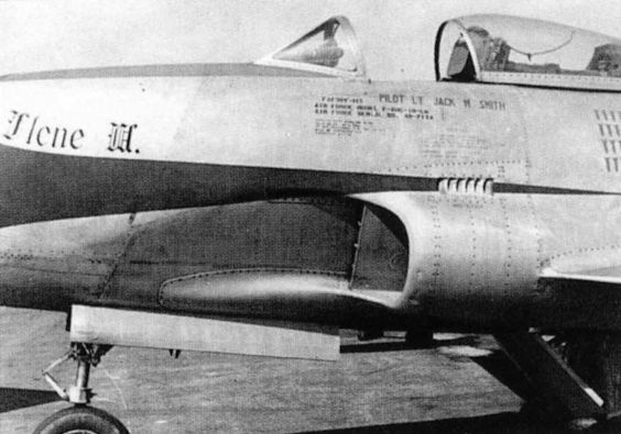This is the only known photograph of F-80C Shooting Star 49-713 Ilene M., assigned to 1st Lt Jack Smith but flown on November 8, 1950, by 1st Lt Russell Brown. Brown is credited with shooting down a MiG-15 in history's first confirmed jet-versus-jet aerial battle.