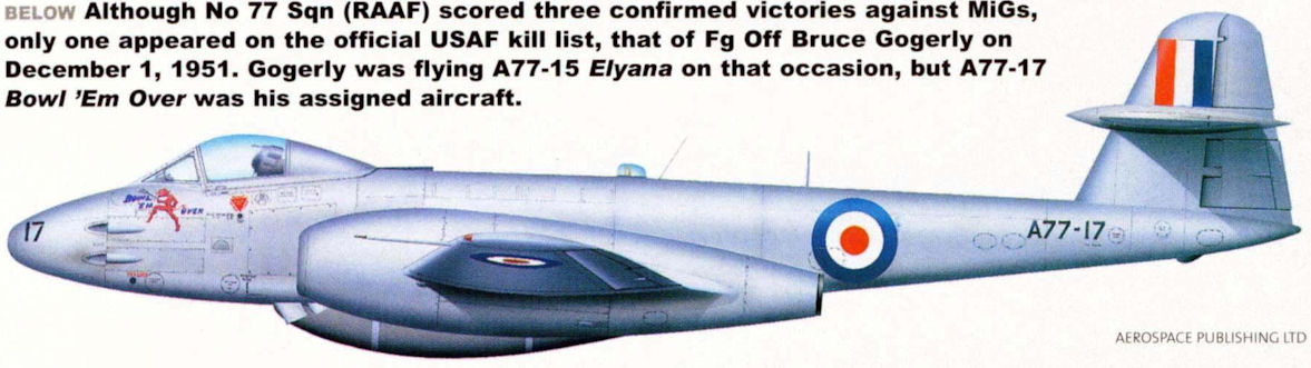Регистрационный номер: A77-17 Although No 77 Sqn (RAAF) scored three confirmed victories against MiGs, only one appeared on the official USAF kill list, that of Fg Off Bruce Gogerly on December 1, 1951. Gogerly was flying A77-15 Elyana on that occasion, but A77-17 Bowl 'Em Over was his assigned aircraft.