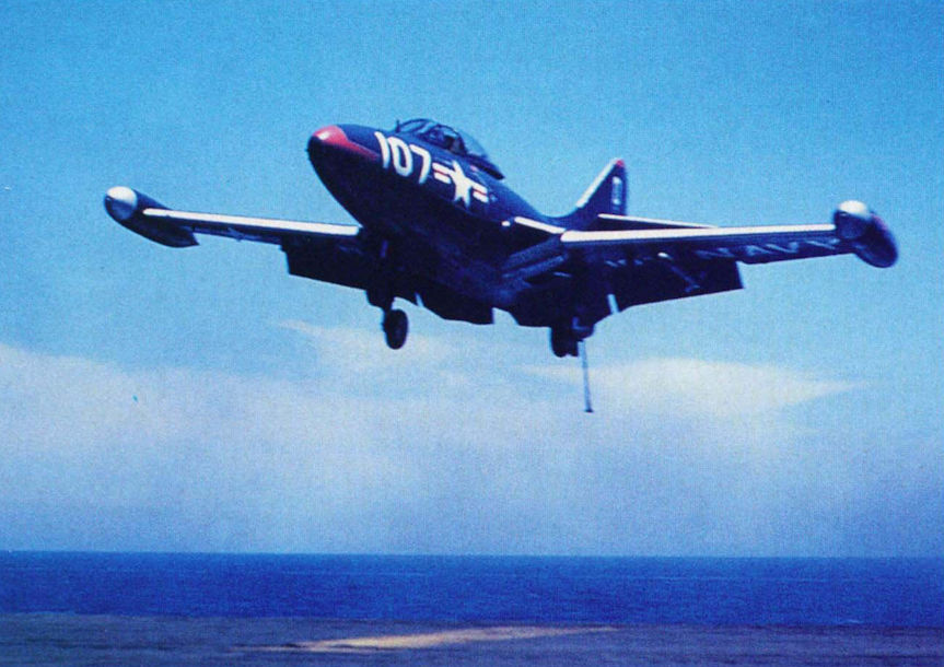 A Grumman F9F Panther comes in for a carrier-landing. Panthers often diverted to the nearest friendly shore base after sustaining battle damage on missions.
