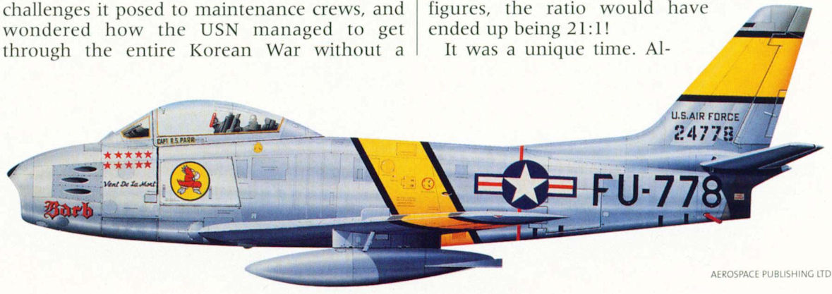 Sabres of the 4th and 335th FIWs originally wore black-and-white stripes as a recognition aid, but all F-86s in Korea were painted with yellow bands in late 1951.