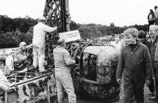 Регистрационный номер: N2980 [6] The wings and centre fuselage of Wellington N2980 shortly after it emerged from Loch Ness on September 21. It is about to be lowered onto the flat barge in the foreground.