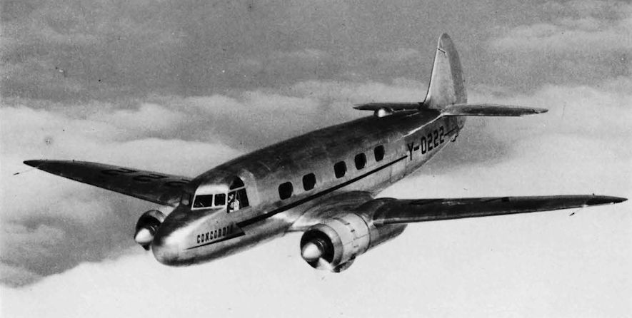 Регистрационный номер: Y-0222 The Cunliffe-Owen Concordia 10-seater Y-0222 was a nice-looking prototype, seen in a photo session soon after its first flight piloted by A.Corbin on 19.5.47. It was powered by two 505 rated hp Alvis Leonides 9-cyl radial engines and had an economical cruise of 190 mph.