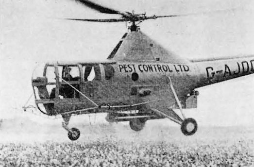 Flight June 17th 1948 *p.659 - Pest Control Ltd demonstrated their Sikorsky S-51 G-AJOO fitted with spraying equipment at Bourn on June 11th. With a capacity of 65 gallons, they were placing orders for three or four WS-51s next year. They had also ordered a version of the Cierva W.11 Air Horse called the Spraying Mantis, which had a 500 gallon capacity (or 2.5 tons of dust) and were interested in a further development, the W.11T, powered by two 1200 hp Merlins, which would have a payload of five tons. Pest Control conducted experimental work with helicopters in 1941 and in 1946 acquired a Sikorsky R4 for practical flight trials.