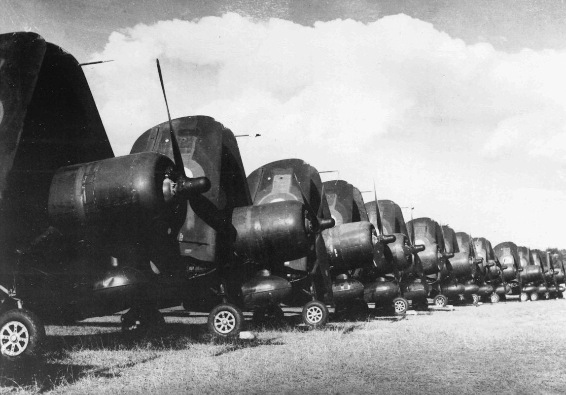 Lined up at Hobsonville on 4 March 1946 before leaving for Japan, are the Corsairs of No. 14 Squadron, RNZAF.