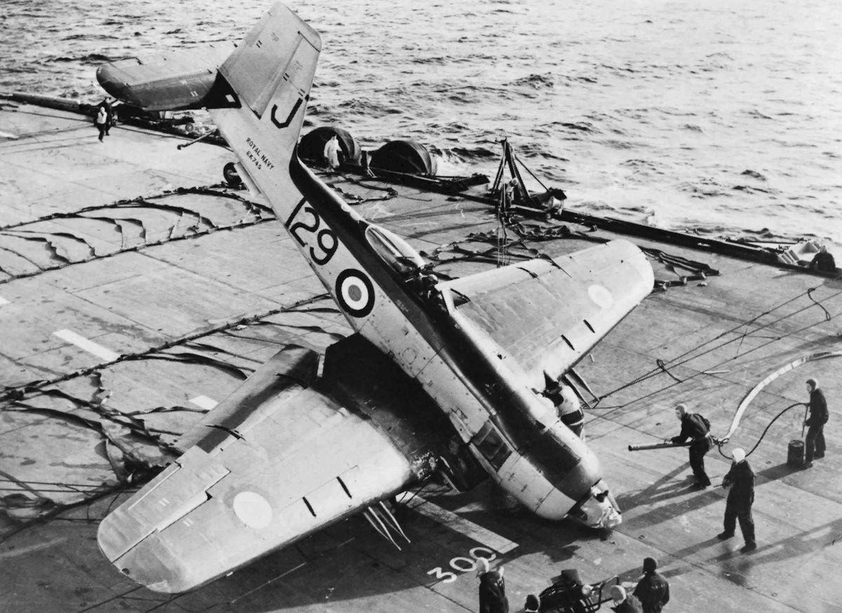 Регистрационный номер: EK745 Firebrand TF.5 EK745 of 827 Squadron hits the barrier aboard Eagle on 30 October 1952
