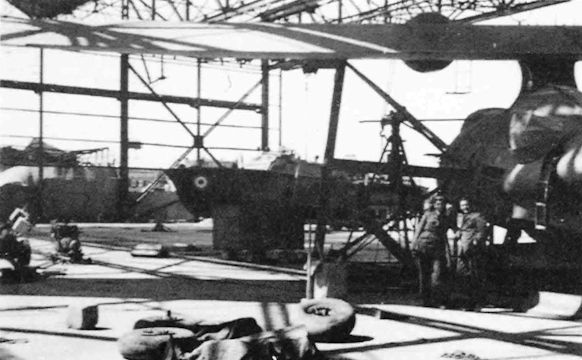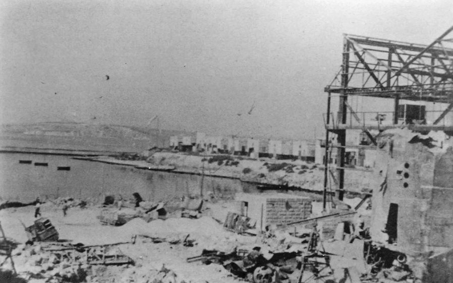 The ramp at Kalafrana has been the background for many photographs of RAF marine aircraft between the wars but this photograph shows a different picture after numerous raids. A land mine landed left centre and wrecked the hangar and a parked Sunderland. One three-bladed propeller can be discerned on the left and various bits of the boat on the right.