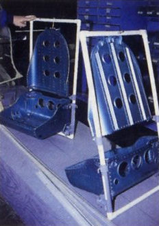 Brand-new pilots’ seats, mounted on plastic plumbing pipes for ease of movement.