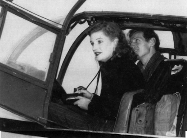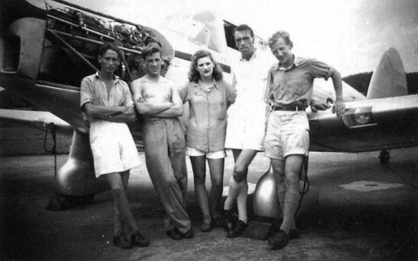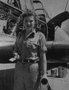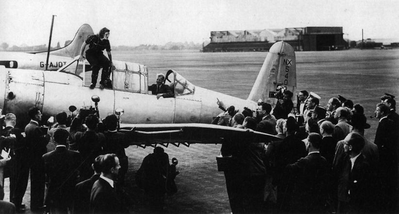 Richarda Morrow-Tait climbs out of the Vultee Valiant at Croydon Airport on August 19, 1949, at the conclusion of her epic 25,000-mile round-the-world trip.