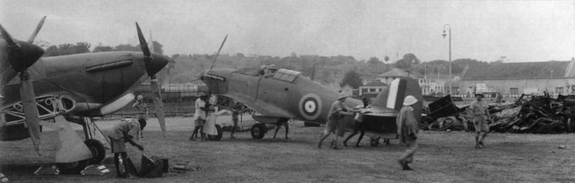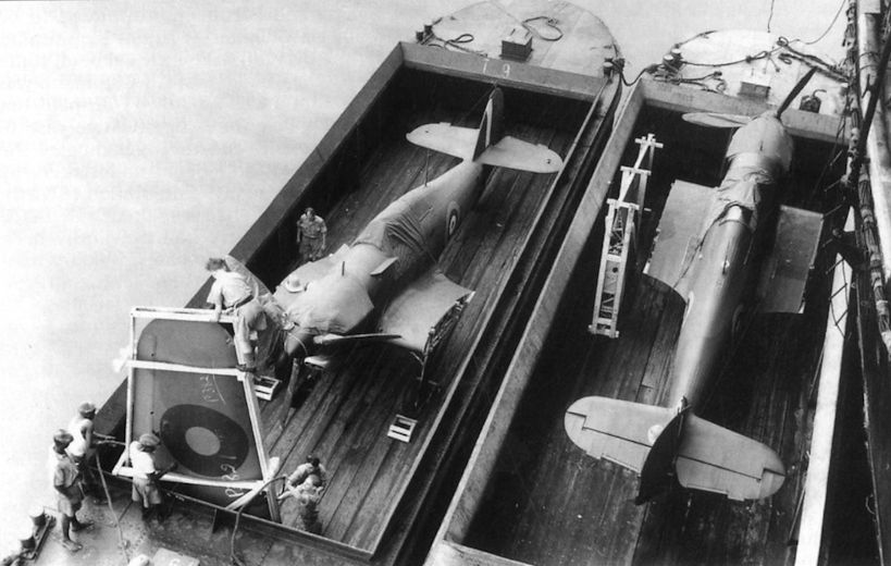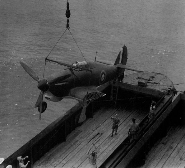 Регистрационный номер: P3821 A brace of Hawker Hurricane Is, probably from HMS Argus, arrive aboard barges at the Takoradi dockside. Someone has thoughfully chalked the identity of the aircraft on the left on the wing panel. It is P3821, which served with 33 and 274 Sqns until it flew into the ground during a practice attack near Burg el Arab on March 10, 1941.