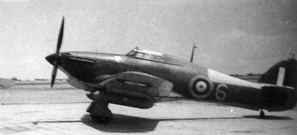 A Hurricane equipped with long-range tanks sits on a Middle East airfield. Note the number painted aft of the fuselage roundel, and the white rear fuselage top-decking. It is believed that the machines being ferried were allocated temporary Flight numbers, and that the white paint was applied to the fuselage and the upper surface of the tailplane to facilitate location of the aircraft in the event of a forced landing.