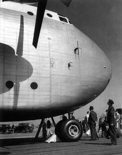 An ATC cadet gazes up in awe at the 20ft-high cockpit of the gargantuan Beverley, displayed at a mid-1950s SBAC show at Farnborough.